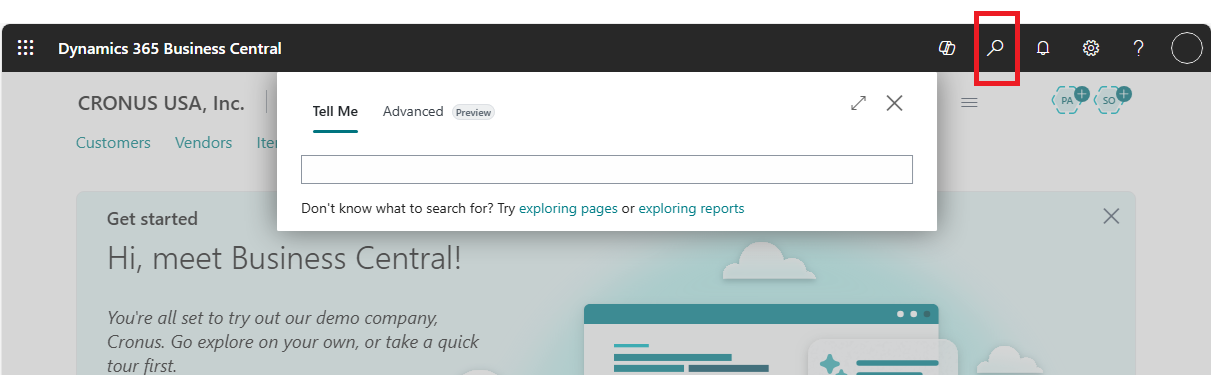 Use Tell Me feature to search for data across Business Central. For example, you can find a customer by entering their name or address, or even find a specific record, such as a sales order. You can also use it to find information in our documentation.